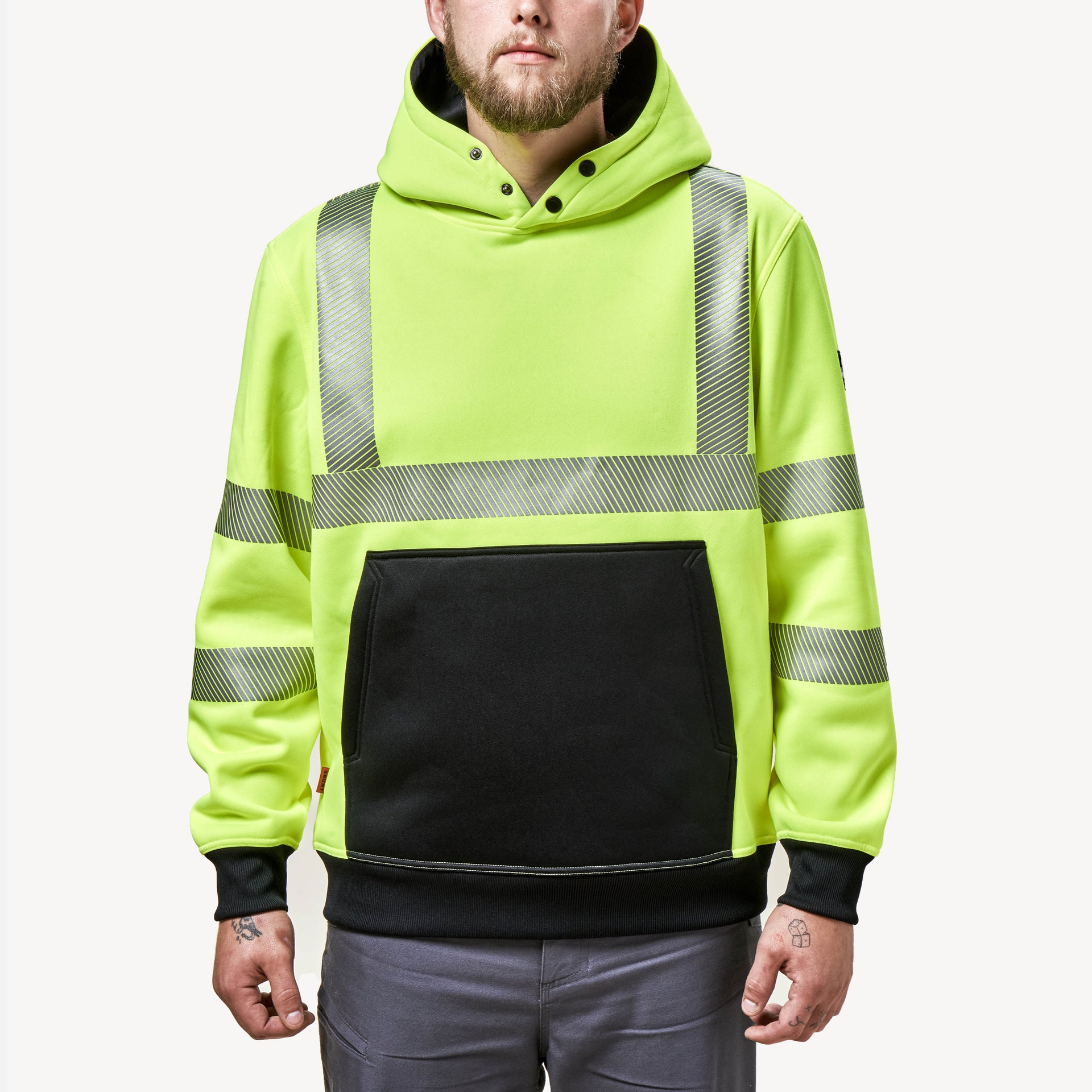 "We love the high vis option in a comfortable and well made hoodie. Very warm as well and the snap buttons sure help keep the wind out."